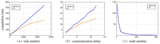 Performance comparison of DCCF-GA and SS in completion time. (a) Comparing the completion time of DCCF-GA and SS when the number of tasks is different; (b) Comparing the completion time of DCCF-GA and SS when communication delay is different. (c) Comparing the completion time of DCCF-GA and SS when the number of satellite nodes is different.