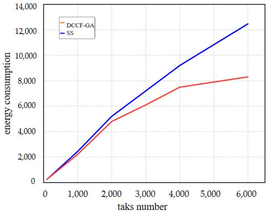 Performance comparison of DCCF-GA and SS in energy consumption.