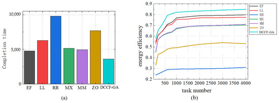 Performance comparison results with other algorithms. (a) Calculate the completion time of other six algorithms; (b) Calculate the energy consumption ratio of other six algorithms. By comparing the experimental results, it can be seen that DCCF-GA is superior to others.