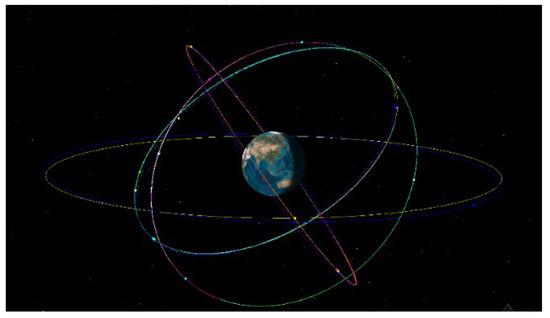 Satellite ephemeris (TLE, Two-Line Orbital Element) is used to describe spaceflight objects’ position and velocity. TLE records the six parameters of the satellite’s orbit. The STK-Java API can realize STK and Java interconnection for secondary development, obtain the parameters of each satellite by reading and cleaning TLE data, and create satellites in batches. As is shown in Figure 11, which is simulating the BEIDOU-3 satellite.