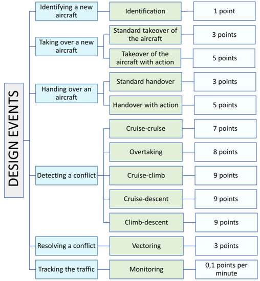 The first aspect that was defined was the key activities carried out by ATCOs in nominal traffic situations. The result can be seen in the six blue rectangles shown in Figure 2, including the identification of an aircraft, the takeover/handover process, the identification of a conflict and its resolution, and, finally, the monitoring of the traffic present in the sector. On the basis of these activities, at least one event associated with each of them was defined. The twelve events considered can be seen in the green rectangles in the figure above. For each event, an average duration and a base score were defined.