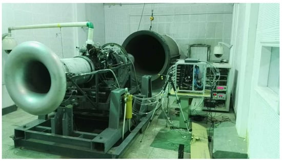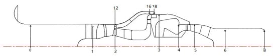 Figure 3 and Figure 4 display the test bench and the general schematic of the 11D turbofan aero engine. The meanings of location index in Figure 4 are as follows: 0—measurement section of inlet total temperature, total pressure and static pressure, 1—measurement section of total pressure, total temperature and static pressure in front of compressor rotor, 2—measurement section of total pressure, total temperature and static pressure behind the first stator, 3—measurement section of total pressure, total temperature and static pressure after centrifugal compressor, 4—total pressure and total temperature measurement section in front of turbine guide vane, 5—measurement section of total pressure and airflow direction after turbine rotor, 6—total pressure and temperature measurement section of nozzle, and 16-measurement section of total pressure, total temperature and static pressure at the outlet of the bypass. The measuring content and distribution of measuring points are shown in Table 2 and Figure 5, taking measurement Section 1, 2, and 6 for example.