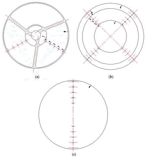 Circumferential distribution of measuring points in: (a) Section 1, (b) Section 2, (c) Section 6.