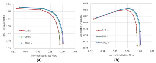 The grid independence is verified before the study. For the single passage case, three types of mesh with different numbers of grid nodes are generated. The number of nodes for the three grid types are 720 k, 904 k, and 1050 k, respectively. The topology of the mesh and the boundary conditions are set as the same. The performance characteristics of the compressor based on these three grids, including the pressure ratio versus the mass flow and the adiabatic efficiency versus the mass flow, are obtained and plotted in Figure 7. The curves of the case with 904 k grid nodes coincide with those of the case with 1050 k grid nodes. In conclusion, when the number of grid nodes exceeds 904 k, the result is considered independent of the number of grid nodes. In consideration of the calculation accuracy and the requirement of saving time, the single passage case with 904 k grid nodes is introduced into this study.