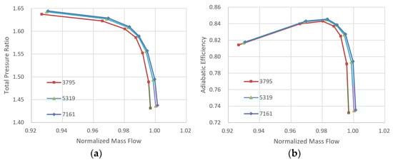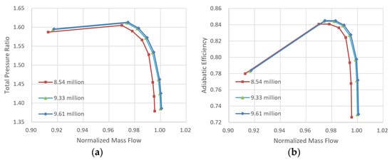 Meanwhile, three types of mesh with different numbers of grid nodes are generated for the full annulus case, and the number of nodes are 8.54 million, 9.33 million and 9.61 million, respectively, with the same mesh topology and boundary condition. The pressure ratio versus the mass flow and the adiabatic efficiency versus the mass flow are shown in Figure 8. It is observed that when the number of grid nodes exceeds 903 million, the result is considered independent of the number of grid nodes. In consideration of the calculation accuracy and the requirement of saving time, the full annulus case with 903 million grid nodes is employed in this study.