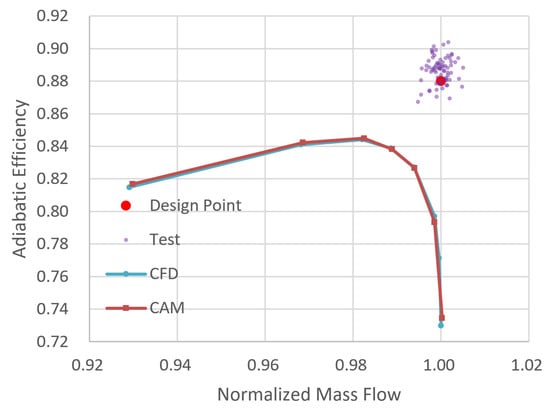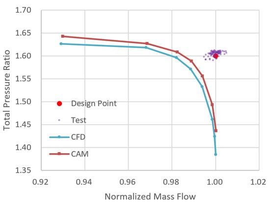 The comparison among the actual experiment, 3D CFD simulation and the origin CAM computation on the total pressure ratio and efficiency of the 11D turbofan engine at 100% speed under uniform intake airflow is shown in Figure 11 and Figure 12. The pressure ratios obtained by both simulation approaches are lower than test results. Specifically, at the operating point, the relative error of mass flow between the 3D CFD and test is −1.14%, the relative error of the total pressure ratio is −1.80%, and the relative error of the efficiency is −4.69%. Additionally, for CAM, the values are −1.11%, −0.72% and −4.75%. Overall, both computational characteristics match the experimental results well, while the full annulus 3D CFD simulation has the ability to calculate the performance and stability of compressor under inlet distortion. Therefore, the 3D CFD simulation may be used to verify the accuracy of the improved CAM on the performance and stability calculation of compressor under inlet distortion in this study. Other test cases from open publications are focused on verifying major trends.