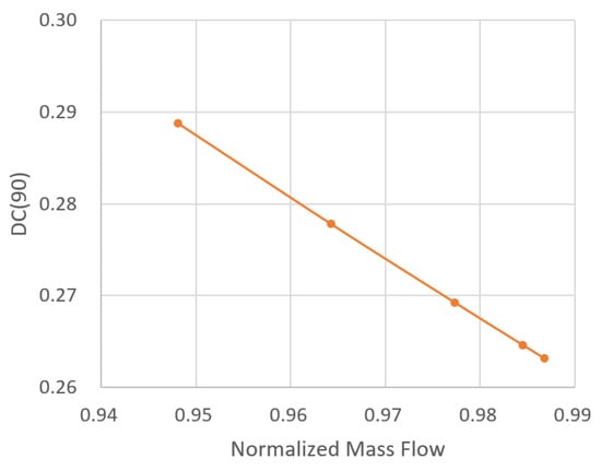 Figure 14 acquired from the full annulus 3D CFD simulation on the 11D compressor with inlet distortion, shows the correlation of versus the mass flow under 100% rotational speed under the condition that the inlet total pressure distribution is determined. When the mass flow decreases, the axial velocity of the inlet AIP decreases, the dynamic pressure decreases, and according to the equation of , increases. The figure shows that the parameter is not a fixed value, but varies with the local condition. It reflects the intensity of total pressure distortion on one hand and the intensity of the dynamic pressure distortion as well.