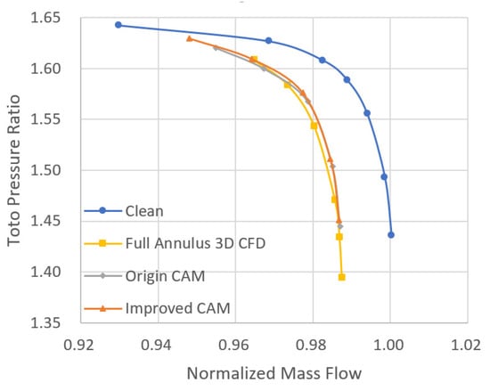 The curve of pressure ratio versus mass flow under the influence of total pressure distortion at 100% speed is shown in Figure 15. The blue curve is from single passage 3D CFD simulation with clean inlet flow for comparison, while the yellow line is from steady full annulus 3D CFD simulation but with distortion. The grey curve shows the result of the origin CAM with constant exit static pressure, and the orange curve shows the result of the improved CAM with corrective exit static pressure obtained from Equation (8). The three performance curves obtained under the inlet distortion condition have basically the same trends. Compared with the uniform inlet characteristic curve, the total pressure ratio under the total pressure distortion at the near stall point decreases and the flow rate increases. The circumferential total pressure distortion makes the characteristic curve of the compressor move downward. With the decrease in flow rate, the ability of the compressor to overcome the distortion becomes weaker, and the performance deteriorates more seriously. Among them, the total pressure ratio loss calculated by steady full annulus 3D CFD simulation is the largest. The stability boundary is under-predicted by the CFD approach due to the inability of mixing planes to deal with asymmetric flows [25]. Meanwhile, stiff outlet boundary condition or the S-A turbulence model [26] may be the reason for the divergence of numerical simulation of high-speed compressor with low flow rate.