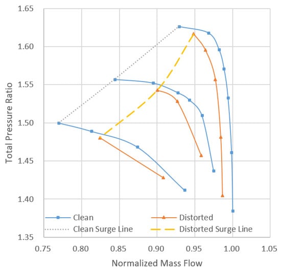 Total pressure ratio versus mass flow rate under distortion at 100% revolution speed.