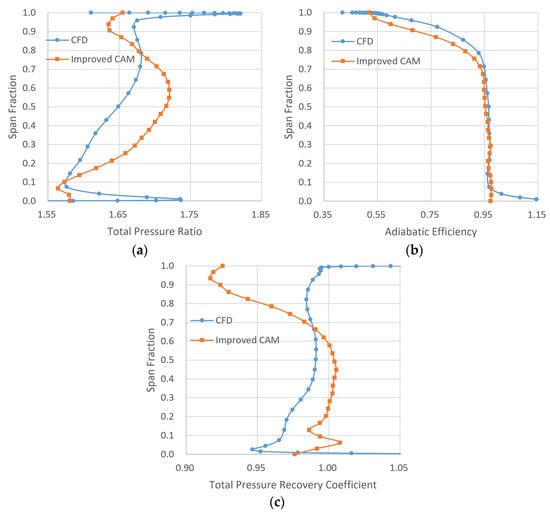 CFD vs. improved CAM span-wise distribution of the 11D compressor parameters with inlet distortion: (a) total pressure ratio of rotor; (b) adiabatic efficiency of rotor; (c) total pressure recovery coefficient of stator.