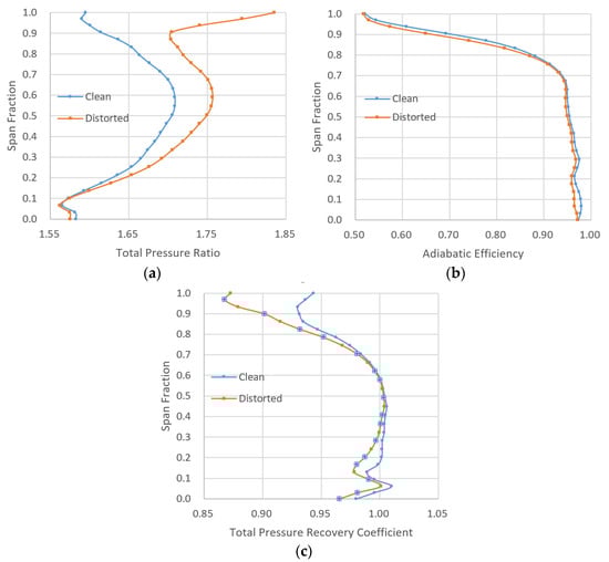 Clean vs. distorted span-wise distribution of the 11D’s parameters: (a) total pressure ratio of rotor; (b) adiabatic efficiency of rotor; (c) total pressure recovery coefficient of stator.