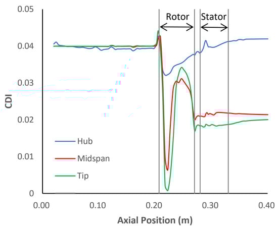In order to study the propagation mechanism of inlet distortion along the axial direction of the compressor, the circumferential distortion intensity (CDI) parameter is introduced here. CDI is the parameter recommended by the Society of Automotive Engineers (SAE) to evaluate the total pressure distortion intensity. For detailed introduction, please refer to reference [27]. Since this study focuses on the axial transmission of distortion, which has little relationship with the radial distribution, the equation is simplified here as follows: