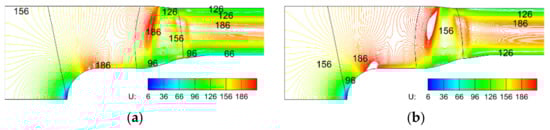 Isoline of the axial velocity for 11D: (a) distorted; (b) clean.