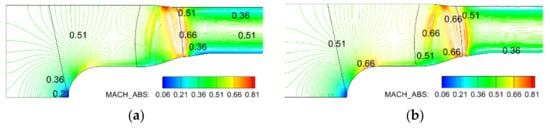 Isoline of the Mach number for 11D: (a) distorted; (b) clean.