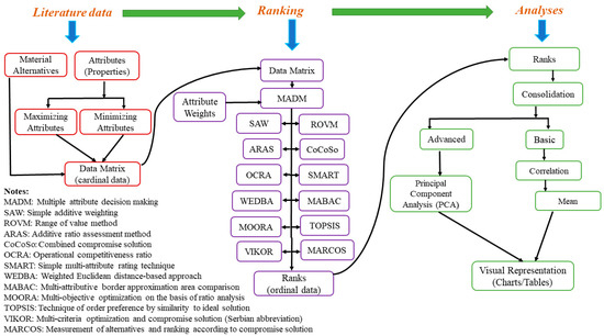 We evaluated the weights by assigning equal weights (1/3) for each of the attributes based on the understanding of these materials and their intended application. We identified twelve MADM methods to evaluate the data matrix and rank the alloys, including the simple additive weighting (SAW) [22,23,53,54,55], range of value method (ROVM) [56,57], additive ratio assessment method (ARAS) [58,59,60], combined compromise solution (CoCoSo) [61,62,63], operational competitiveness ratio (OCRA) [64,65,66], simple multi-attribute rating technique (SMART) [22,53,67,68], weighted Euclidean distance-based approach (WEDBA) [23,69,70], multi-attributive border approximation area comparison (MABAC) [71,72], multi-objective optimization on the basis of ratio analysis (MOORA) [73,74], technique of order preference by similarity to ideal solution (TOPSIS) [22,53,75,76], multi-criteria optimization and compromise solution (VIKOR)—the Serbian name is VIse Kriterijumska Optimizacija Kompromisno Resenje—method [77,78,79], and measurement of alternatives and ranking according to compromise solution (MARCOS) [80,81]. Each MADM approach comprises a unique mathematical aggregation procedure to rank the alternatives. The MADMs identified were diverse. Applying such distinct aggregation procedures is likely to generate a robust set of ranks of the alternatives. The ranks produced by each method, as would be expected, are likely to deviate from one another; nevertheless, the correlation among the various techniques is expected to strengthen the reliability of the results. The modus operandi was soft coded in Microsoft Excel, as formulated in the respective references of MADMs.