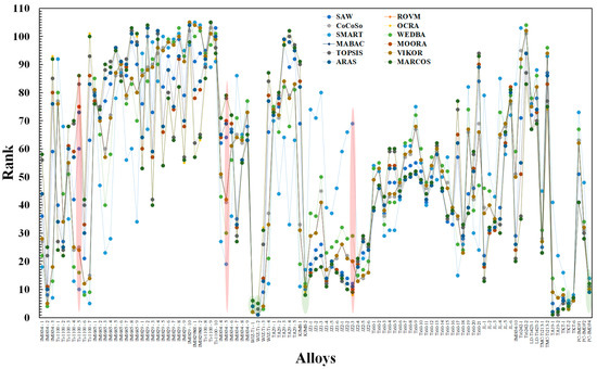 Figure 2 presents the ranks of the near-α Ti alloys from the literature evaluated by the 12 MADMs. The ranks of the alloys represented as points in the figure by nature are discrete; thin dotted lines for a better visual effect connect the ranks assessed by each of the MADMs. Despite the unique mathematical aggregation procedures in various MADMs, the peaks and troughs of several MADMs somewhat coincide. For example, several MADMs assign similar ranks to WJZ-Ti-2, TKT-2, WJZ-Ti-1, PC-IMDF4, and KIMS-2 (green-shaded). Moreover, the rank assigned by various MADMs to most alloys differs significantly, for instance, as in the alloys designated as Ti-1100-5, IMI834-5 and JZ2-3 (pink shaded). Table 1 presents the Spearman rank (Sρ) that correlates ranks evaluated by the 12 MADMs. For example, the Sρ between CoCoSo and ROVM, MABAC and WEDBA, or MARCOS and TOPSIS is >0.95, which indicates strong correlations. On the contrary, Sρ between ARAS and SMART or TOPSIS and SMART is less than <0.3, which is expected owing to the distinct mathematical aggregation formulation in various MADMs. Out of the 66 combinations of MADM pairs, ~72% have rank correlations equal to or above 0.70, which elicits the robustness and validity of the ranking of the near-α Ti alloys. Therefore, it is imperative to consolidate the ranks obtained from various MADMs. Based on Sρ among all various combinations of MADMs, it is practical to consolidate the rankings evaluated by the 12 different MADM evaluations. Accordingly, the mean-based (arithmetic mean) rank consolidation of Figure 2 is shown in Figure 3. The ranks of the top ten data points are WJZ-Ti-2, WJZ-Ti-1, TKT-2, TA19-2, TKT-6, TKT-1, TA19-1, KIMS-2, IMI834-2, and PC-IMDF4 in that order.