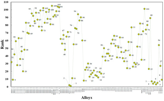 The arithmetic mean-based rank consolidation of the near-α Ti alloys from the literature evaluated by the 12 multiple attribute decision making (MADM) methods. The ranks of the top 10 data points are WJZ-Ti-2, WJZ-Ti-1, TKT-2, TA19-2, TKT-6, TKT-1, TA19-1, KIMS-2, IMI834-2, and PC-IMDF4 in that order.