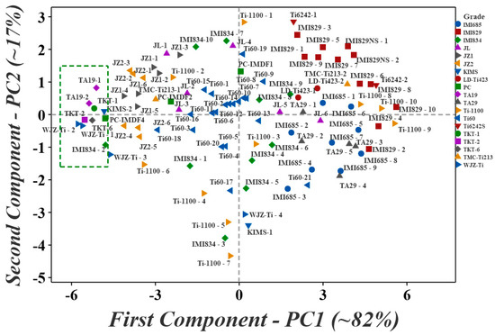 Figure 4 is the score plot that presents the consolidated rank by PCA, of the near-α Ti alloys. It is the plot of the first two components (PC1 and PC2), post-reduction of the data dimensionality (i.e., ranks from 12 MADMs) into a two-dimensional space. Table 2 presents the eigenvalues (and their proportion) that capture the variation of the distribution of each principal component. The first principal component (PC1) captures ~82% of the variation or scatter in the original data, while the second principal (PC2) describes ~17% of the variation. Since PC1 captures nearly 82% of the variation in the initial 12 dimensions (sets of ranks), it approximates the rank of near-α Ti alloys. An imaginary reference line perpendicular to PC1 traversing from left to right (−6 to 6) indicates the overall ranks of the near-α Ti alloys. The alloy grades WJZ-Ti, TKT-2, TA19, TKT-6, TKT-1, KIMS, IMI834, and PC top the list, followed by JZ1, JZ2, Ti-1100, and so on. The ranks of the top ten data points are WJZ-Ti-2, WJZ-Ti-1, TKT-2, TA19-2, TKT-6, TKT-1, TA19-1, KIMS-2, IMI834-2, and PC-IMDF4 in that order (the data points within the box in Figure 4), while certain variants of WJZ-Ti, JZ1, and JZ2 also appear promising (the data points close to the box). The top-ranked alloys by PCA-based consolidation are strikingly similar to the top-ranked alloys evaluated by mean-based consolidation. Specifically, the PCA-based consolidation refines the IMI834-2 (rank#9) and PC-IMDF4 (rank#9) assigned by mean-based consolidation to rank#9 and #10, respectively. Therefore, it is logical to label the score plot of PCA-based consolidated ranks as a ‘rank chart’.