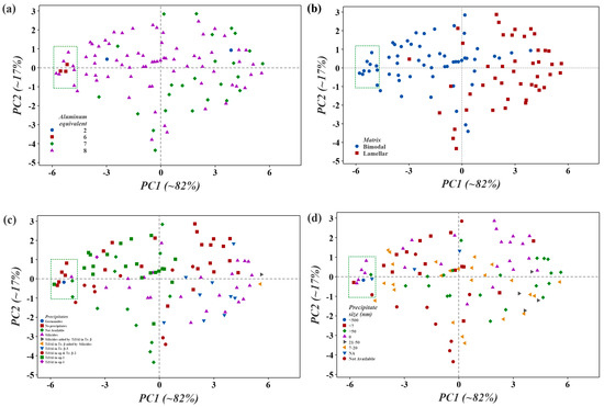 Score plots by the principal component analysis (PCA) of the ordinal data, i.e., PCA-based rank consolidation of the near-α Ti alloys evaluated by the 12 MADM methods through the lens of, i.e., categorized based on (a) aluminum equivalent, (b) matrix, (c) precipitates, and (d) precipitate size. The region of interest (green box) shows the top-ranked ten alloy variants.