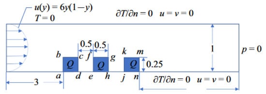 The test example is the forced convection cooling problem that flows through three rectangular heated solids between two parallel plates. This problem was first proposed by Davalath and Bayazitoglu [] to simulate the cooling of integrated circuit components. The computational domain and boundary conditions of the problem are shown in Figure 1; the upper and lower walls are adiabatic, the inlet velocity is parabolic, the inlet temperature is 0, and the outlet pressure is 0. Monitoring points (a–n) are set around the three rectangular blocks. The fluid enters from the left side and flows out from the right side with a fully developed velocity profile. The heat generated in the three solid blocks can be assumed to have a uniformly distributed heat source term.