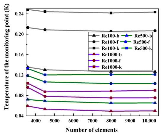 Effect of the number of elements on the temperature at three different monitoring points (b, f, k) in the simulation area at Reynolds numbers of 100, 500, and 1000.