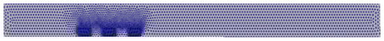 In practical engineering calculations, unstructured meshes are highly adaptable to simulate complex geometries more finely and can dynamically assign grid cells and reduce the number of grid cells. To illustrate the adaptation of this novel optimization strategy to unstructured meshes, unstructured meshes are, therefore, used to validate the simulation results. Four different grid numbers were used to obtain the flow field parameters for grid-independent verification and to determine the appropriate number of grids. Figure 2 shows the variation in the temperature of the monitoring points in the grid with the grid number for different Reynolds numbers, and it can be seen that the grid containing 7984 linear triangular elements already has sufficient accuracy to characterize the flow field information, so this grid is used for subsequent calculations, as shown in Figure 3.