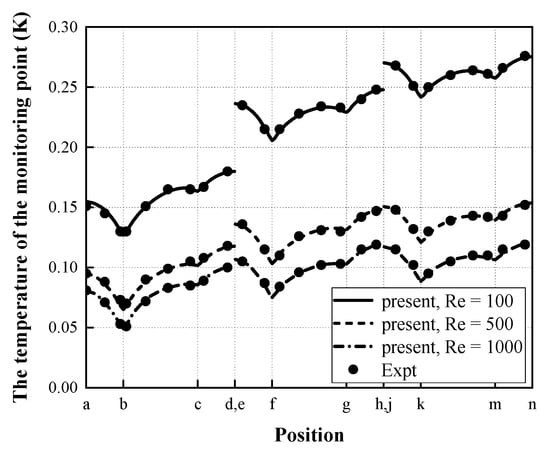 Comparison of the simulation results of the temperature at different monitoring points along the solid–fluid interface for rectangular blocks at Re = 100, 500, 1000 with the experimental data of Ref. [].