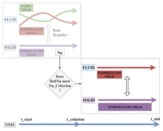 When the fluid tends to a stable state, the Nusselt number will also gradually stabilize. Therefore, this paper monitors the change in the average Nusselt number (DeltNu) on the solid surface and determines the end time (t_criterion) of the initial state when the change is less than the specified criterion, as shown in Figure 5. The flow field information at this time is used to update the temperature field in the fluid and solid the next time.