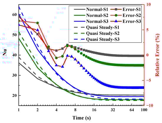 The variation curves of the average Nu on the surface of solids 1, 2, and 3 (S1, S2, S3) are shown in Figure 6. It is found that Nu gradually decreases with the heat transfer process and finally remains stable, indicating that the average temperature response of the solid surface gradually moves away from the inlet fluid temperature. The three solids using the quasi-steady algorithm produced large errors of about 5% in initial calculations. At the end of the final calculation, the error of Nu close to the solid at the entrance using the quasi-steady algorithm is close to 0 compared with the traditional algorithm, and the closer the solid position is to the entrance, the greater the relative error. The maximum relative error of the quasi-steady algorithm at the initial stage of calculation is about 7.6%, and the maximum error at the end of the calculation is about −6.5%.