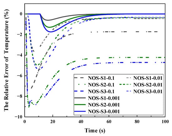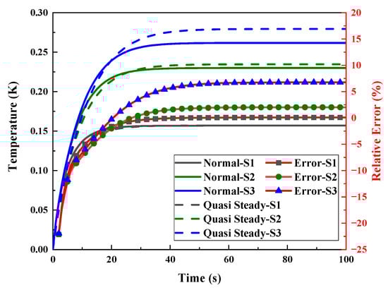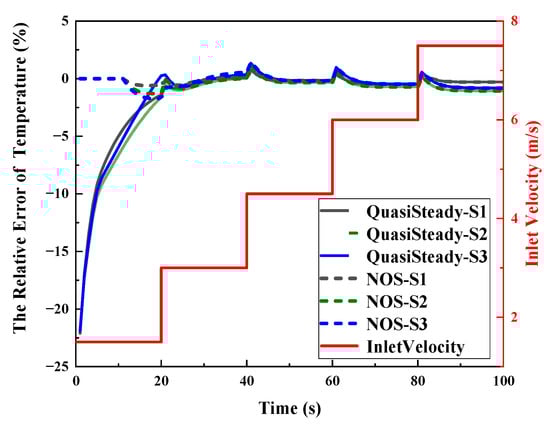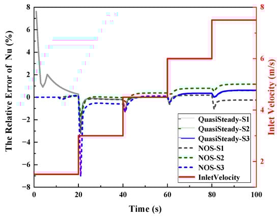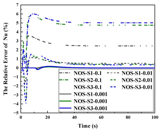 Figure 11 shows the relative errors of the average solid surface temperature for the quasi-steady algorithm and the NOS algorithm after adding velocity perturbations in each time period. The relative errors of the three solid surface average temperatures during 0–20 s are −22.4%, −22.1%, and −22.0% for the quasi-steady algorithm and −0.6%, −1.3%, and −1.3% for the NOS algorithm, respectively. The NOS algorithm optimizes the relative errors of the quasi-steady algorithm by 97.3%, 94.1%, and 94.1%. Within 20–100 s, the absolute value of the error is stable within 2.5%, which means that the error will be controlled within a certain range when the speed boundary disturbance is added and the variation standard of Nu is 0.001.