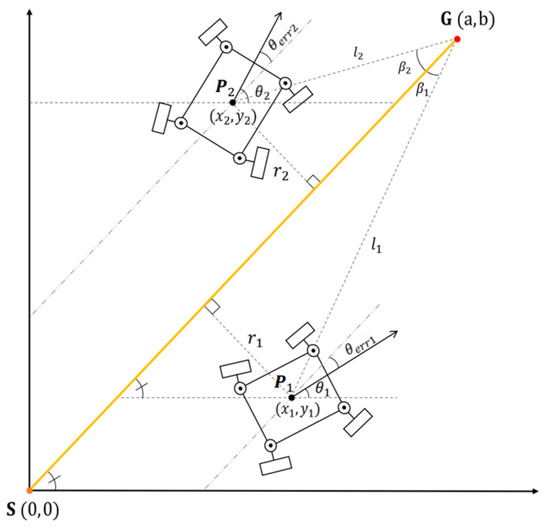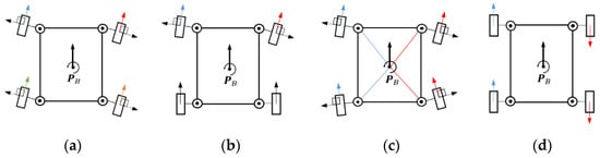 Each wheel’s rolling speed in Equation (5) can be expressed as a relationship between the radius connecting each wheel and the rotation center point and the angular velocity of the entire robot trajectory. In addition, is also associated with the steering velocity of wheel alignment , where refers to the radius of each wheel.