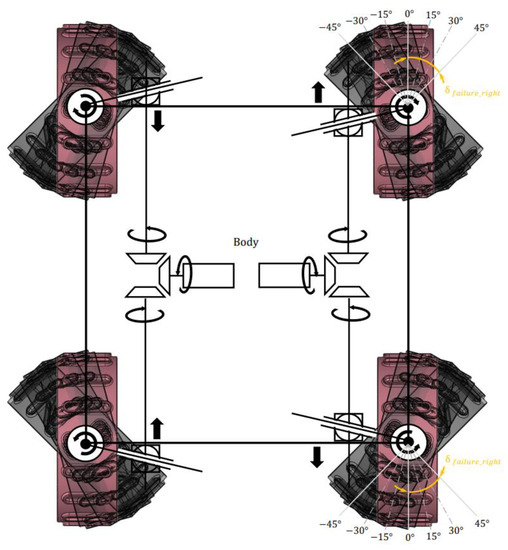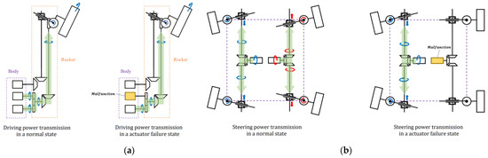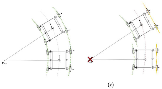 Figure 2b presents two situations, one in which the right steering motor works properly and one where it breaks down, respectively. Figure 2c illustrates the situation where the steering control of the rover is lost due to the failure of the right steering motor. Due to the addition of actuators in the driving system, there is a physical limit to the degree of hardware redundancy in the steering system. Therefore, a software-level solution must be prepared to respond to a failure in the steering motor, and this will be described in more detail in Section 3.