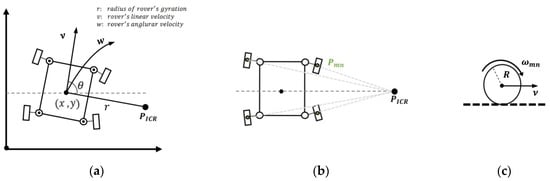 These results indicate that the kinematic model of the rover can be mathematically approximated in the condition where all motors are working properly [4]. Rover control can be implemented using this approach. More specifically, the forward kinematics can be calculated with respect to motor control inputs using the relationships defined in Equations (3) and (7). As a result, the radius of gyration and angular velocity of the rover can be obtained in the 2D Cartesian frame, and the rover’s status can, accordingly, be controlled, as shown in Figure 3a.
