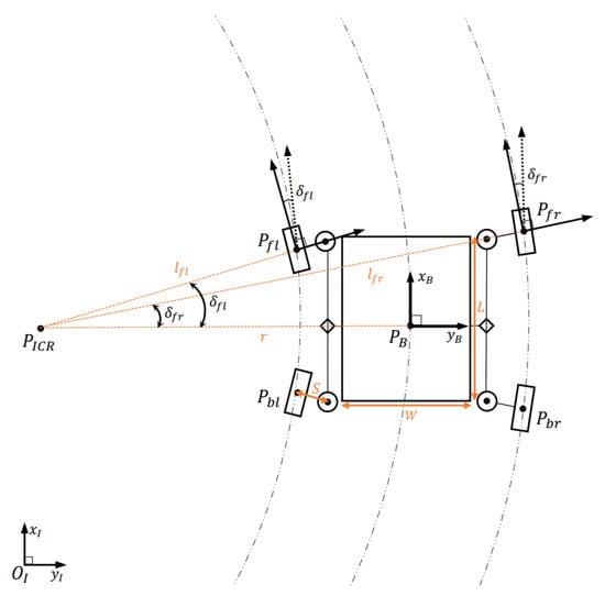As shown in Figure 4, the radius of gyration of each wheel can be defined as in Equation (4), given its symmetric steering structure, where the constant refers to the steering offset due to the physical limit of wheel alignment.