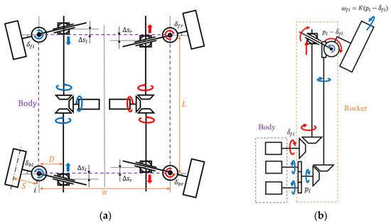 Therefore, as shown in Figure 4, the distance between this point and the center point of the rover body corresponds to the radius of gyration of the rover, and thus the alignment of each wheel can be expressed as in Equations (1) and (2), where L and W refer to the length and width of the robot body, respectively.
