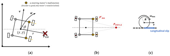 Illustrations of 2D kinematic analysis when the right steering motor malfunctions. (a) Pose of the robot on a 2D Cartesian coordinate system. (b) ICR of each wheel under the lateral slip condition. (c) Side view under the longitudinal slip condition.