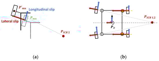 Second, given that the rover moves at a very low speed of about 1 cm/s, lateral slip can be considered insignificant compared to the longitudinal rolling of each wheel. Accordingly, a non-lateral slip condition can be assumed, as shown in Figure 3b. Under this condition, the alignment of each wheel corresponds to the tangential direction of the gyration trajectory of the robot, and thus the rotation center point of each wheel ends up being aligned with the instant center of gyration .