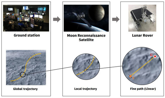 For a Moon exploration mission, the global trajectory of the rover generated by the ground station is segmented into sets of local trajectories before being delivered, due to time delays and the rover’s slow-moving speed. Each local trajectory is further subdivided into sets of fine paths at the sequence level before being transmitted to the rover.