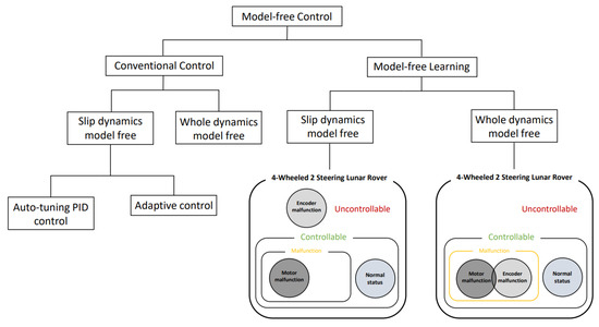 As earlier discussed in Section 2, no kinematic or dynamic models are available to simulate lunar rover control of a rover that experiences a failure in its steering motor. Thus, a model-free control approach is required to address this issue. Reinforcement learning (RL) has been proposed as a solution to rover motion control in such a situation, because it avoids the limitations of conventional control methods, which require well-formulated models. As shown in Figure 9, model-free learning can be used for the whole dynamics of the system, and is effective to not only address locked-wheel issues caused by motor malfunctions, but also to maintain controllability, even in free-wheeling conditions resulting from encoder malfunction.