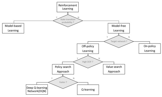 As shown in Figure 10, RL can be largely divided into model-based learning and model-free learning according to the probability of state transition [41]. In lunar rover control, state transition probabilities, which correspond to kinematic or dynamic models, cannot be mathematically formulated in the event of a failure in the steering motor [45]. Alternatively, model-free learning is employed as a solution for failure-free motion planning. Off-policy learning is a type of model-free learning where updating a current policy requires a target policy [56,57]. In rover motion planning, the target policy is defined as a policy that minimizes the distance from the optimal path.