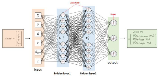 The overall structure of the DQN is presented in Figure 11. This neural network receives six inputs related to the current state of the robot and produces three types of actions as outputs. The network contains two hidden layers that use Leaky-ReLU as an activation function, as well as a mean squared error (MSE)-type loss function. Its optimizer is composed of Adam [60].