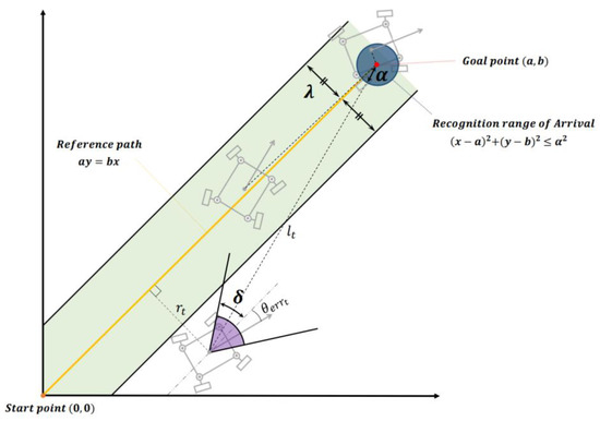 A lunar reconnaissance orbiter orbits around the Moon while observing the rover from a direction perpendicular to it at all times. Thus, the position of the rover can be expressed on a 2D Cartesian coordinate system, as shown in Figure 12. The current position of the rover ( and ) and the target point of a given linear path ( and ) are observed in the environment. In addition, the remaining distance between the current position of the rover and the target point (), the azimuth error between the target point direction and the rover moving direction (), and the vertical distance between the current position of the rover and the linear path () can be accordingly calculated. As a result, a total of five variables are selected as a state group. Equations (11) and (12) present the definition of the state group and equations used to calculate the variables , , and are included in the state group.