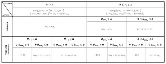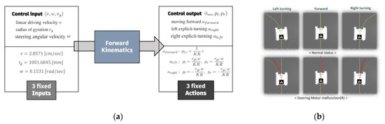 Accordingly, in this paper, the action group was set to have only three different options by fixing the control inputs of the forward kinematics used in the situation where the steering system worked properly. The approximated kinematic model cannot be used in the case of a failure, but in a normal state, motion planning is performed through learning. The robot can be controlled as desired using only three different steering motions, which are implemented when each set of specific inputs is entered. Simply put, the linear velocity , angular velocity , and gyration radius were fixed at specific values, and accordingly, the action group was set to have only three moving directions , , and , as shown in Equation (13).