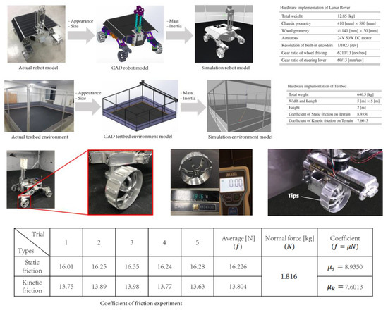 In addition, existing four-wheeled mobile robots with non-holonomic characteristics exhibit low mobility on the Moon’s surface, where wheel slip is maximized due to microgravity and soft soil [5]. Furthermore, a failure in the steering motor of a rover may affect its wheel alignment. Even when only one of the four wheels becomes misaligned, the overall locomotion of the rover will be significantly affected by slippage [3]. However, most studies on mathematical dynamics models concerning the interaction between the Moon’s surface and the rovers’ wheels have been based on a single wheel–terrain interaction and, thus, the results do not necessarily guarantee that the same degree of controllability would be achieved in four-wheeled systems.