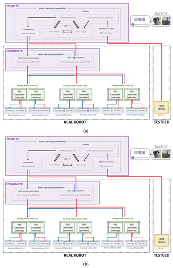 - Quigley, M.; Conley, K.; Gerkey, B.; Faust, J.; Foote, T.; Leibs, J.; Wheeler, R.; Ng, A.Y. ROS: An open-source Robot Operating System. In Proceedings of the ICRA Workshop on Open Source Software, Kobe, Japan, 12–17 May 2009; p. 5. [Google Scholar]