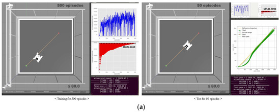 Threshold values, including the distance , angle , and area , refer to margin ranges for , and , respectively. Learning intensity can be controlled by adjusting these constants. More specifically, the smaller the set margin value is, the more rigorous the reward strategy becomes; this means that the robot can be trained to perform more detailed motions. Accordingly, the value should be set smaller to allow the robot to approach the reference path faster and stay closer to the path while driving. If one intends to reduce the possibility that the robot will deviate from the reference path and improve its ability to stay close to the path, the value must be reduced.