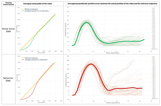 An overall comparison of the two methods is presented in Figure 27. The averaged actual paths of the robot in a failure state showed that the DQN-based motion planner allowed the robot to approach the reference trajectory relatively faster than the path follower using the PID controller. The perpendicular position errors between the current position of the rover and the optimum reference trajectory also verified the superiority of the DQN-based motion planner in path-tracking performance.