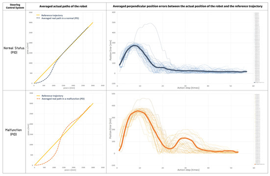 The results of the second experiment showed that, in a normal state, the Path Follower based on the PID controller with optimized turning parameters was superior to the DQN-based motion planning method in terms of the ability to approach the optimum path and the path-tracking ability. However, when the steering motor failed, the robot approached the reference path at a later step (, ) when the PID controller was used with the same parameters applied, as shown in the averaged actual paths of the robot. Furthermore, the position error between the current position of the rover and the reference trajectory exceeded the threshold , indicating that the path tracking had not been effectively performed in a reliable manner.