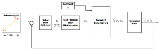 The control loop of the PID Path Follower used in the experiment is presented in Figure 26. The controller receives data on the position error () between the robot’s current position and the reference trajectory as a control input from the robot state calibrator. Subsequently, the controller adjusts the robot’s steering angular velocity on a 2D Cartesian coordinate system to minimize this position error. The PID Gain was set as follows: , I, and . These values were determined from repeated parameter tuning, which ensured that the 4-wheeled 2-steering lunar rover would exhibit its best performance as a mobile platform in a normal state.