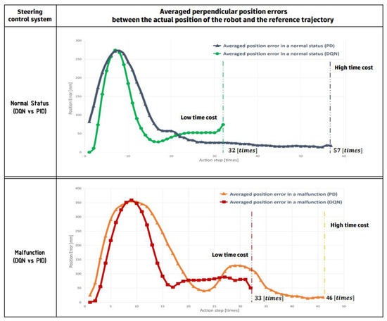 Further result analyses are presented in Figure 28. In the normal state, the number of steps required for the rover to reach the target point was for the PID controller and for the DQN-based motion planner, respectively. In the failure state, the figure was for the PID controller and for the DQN-based motion planner, respectively. Regardless of the steering motor failure, the DQN-based motion planner was found to be more efficient, requiring less time for the rover to arrive and, thus, reduced costs.